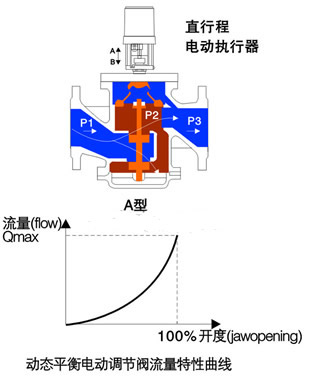 ⑵、當(dāng)直行程電動(dòng)執(zhí)行器接受控制信號(hào)使閥軸延A—B向上下運(yùn)動(dòng)(或角行程電動(dòng)執(zhí)行器接受控制信號(hào)使閥軸延R向旋轉(zhuǎn))時(shí),P2、P3間的開(kāi)度也隨之變化。由于不管系統(tǒng)壓差(P1-P3)如何變化,P2、P3間的壓差(P2-P3)始終不變,因此對(duì)應(yīng)于任一開(kāi)度位置,其輸送的水流量都是一定的,并且電動(dòng)調(diào)節(jié)閥實(shí)際的流量特性曲線與其理想的流量特性曲線是一致的,沒(méi)有偏離。因此這種電動(dòng)調(diào)節(jié)閥較傳統(tǒng)的電動(dòng)調(diào)節(jié)閥具有更好的調(diào)節(jié)特性。