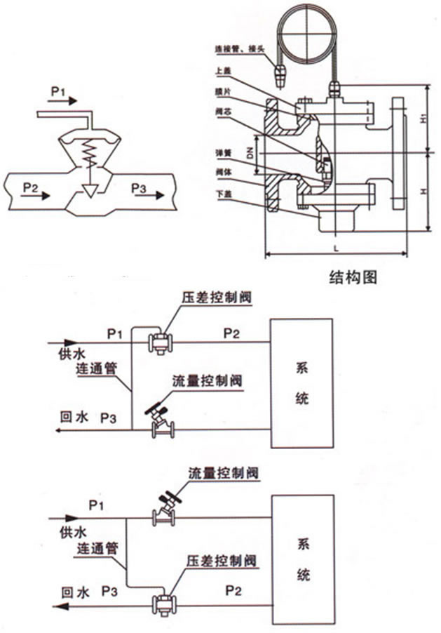 現(xiàn)以安裝在回水管道上的DFS-ZYC-16型自力式壓控制閥為例說(shuō)明工作原理。當(dāng)供水壓力P1增大或減小時(shí),信號(hào)由連接管傳達(dá)室入膜片上腔,帶動(dòng)閥芯下移或上移,使閥座的流通面積減小或增大。P2-P3也增大或減小,直到P1-P2保持原值怛定,當(dāng)回水壓力P3增大或減小的瞬間增高或降低,帶動(dòng)閥芯上移或下移,直到膜片的受力重新平衡,P2恢復(fù)原值,P1-P2保護(hù)原值恒定,從而保證了被控系統(tǒng)的供回水間壓差基本不變。